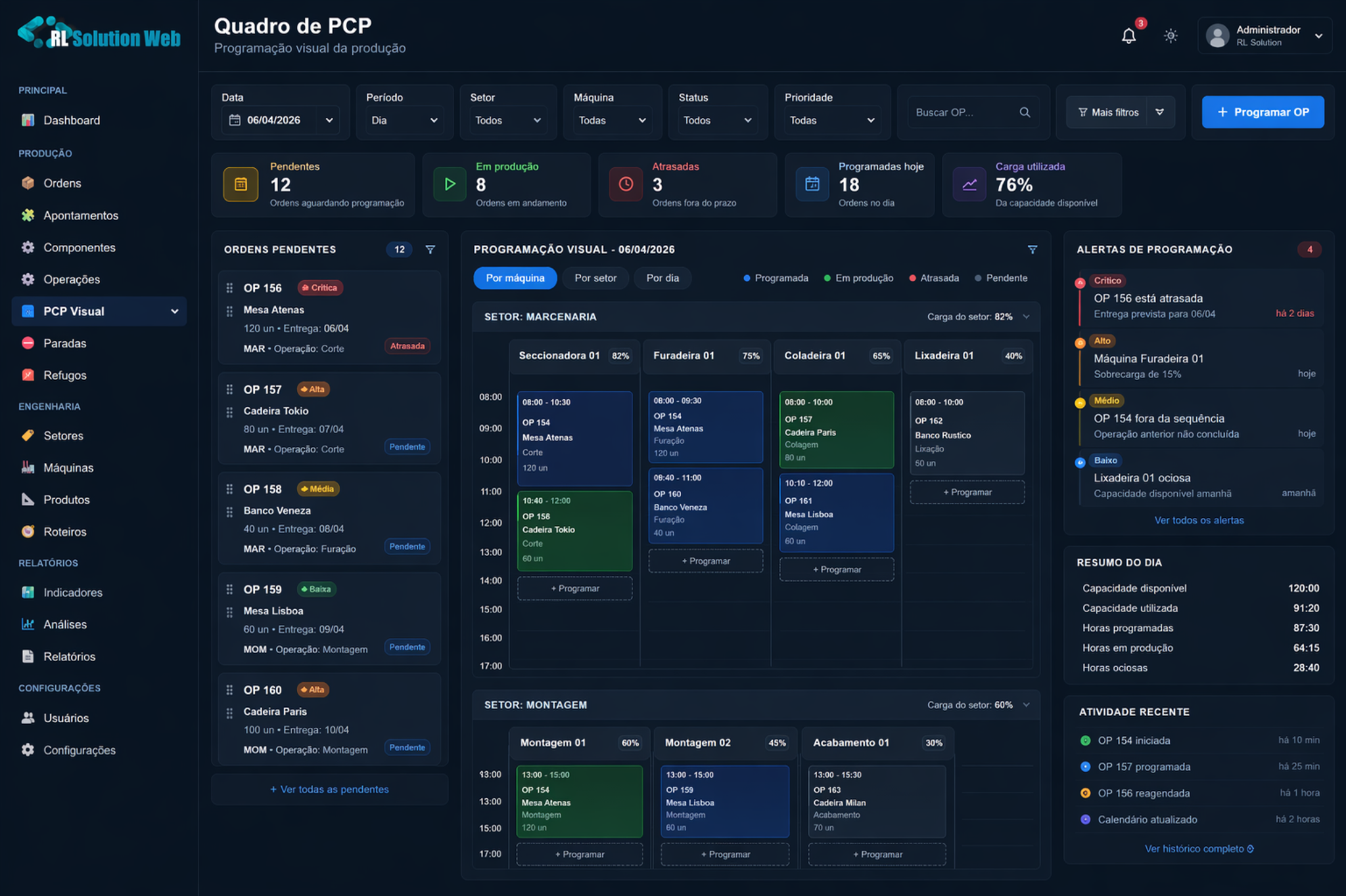 A tela do PCP Visual centraliza ordens pendentes, programação por máquina, alertas de programação, resumo do dia e atividade recente. Ela mostra a organização da produção por recurso e por horário dentro do sistema.