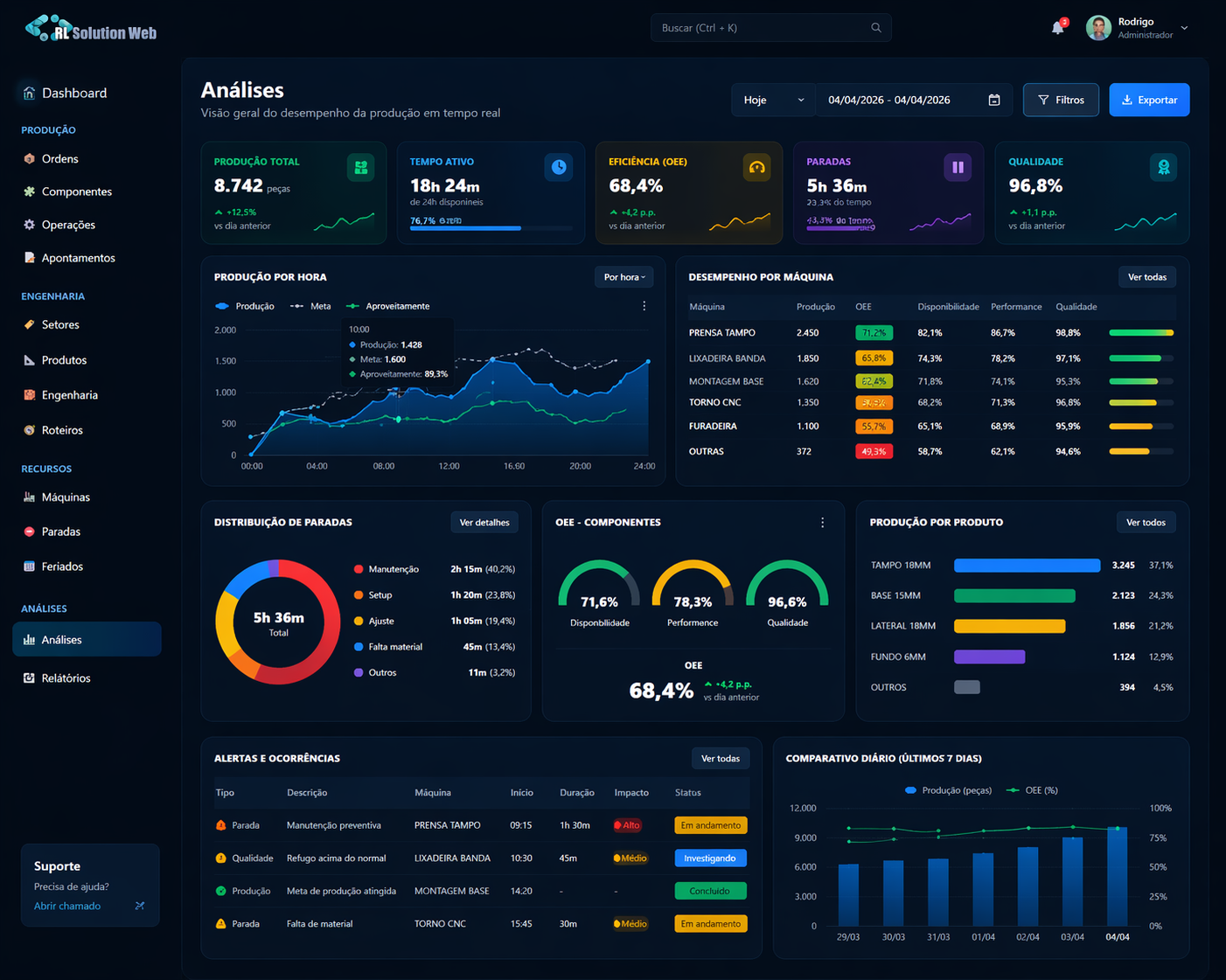 As telas complementares reforçam a leitura do sistema com visão operacional e analítica, conectando programação, execução, indicadores e acompanhamento da produção em um único ambiente.