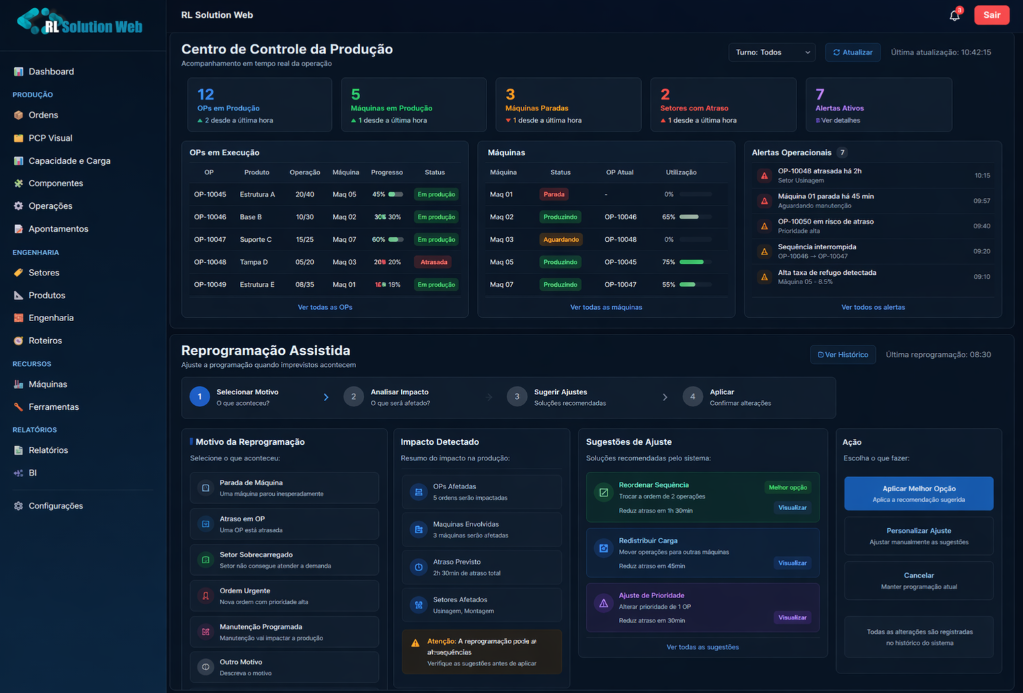 A tela do PCP Visual centraliza ordens pendentes, programação por máquina, alertas de programação, resumo do dia e atividade recente. Ela mostra a organização da produção por recurso e por horário dentro do sistema.